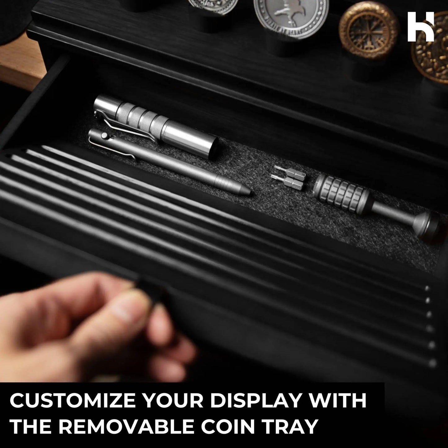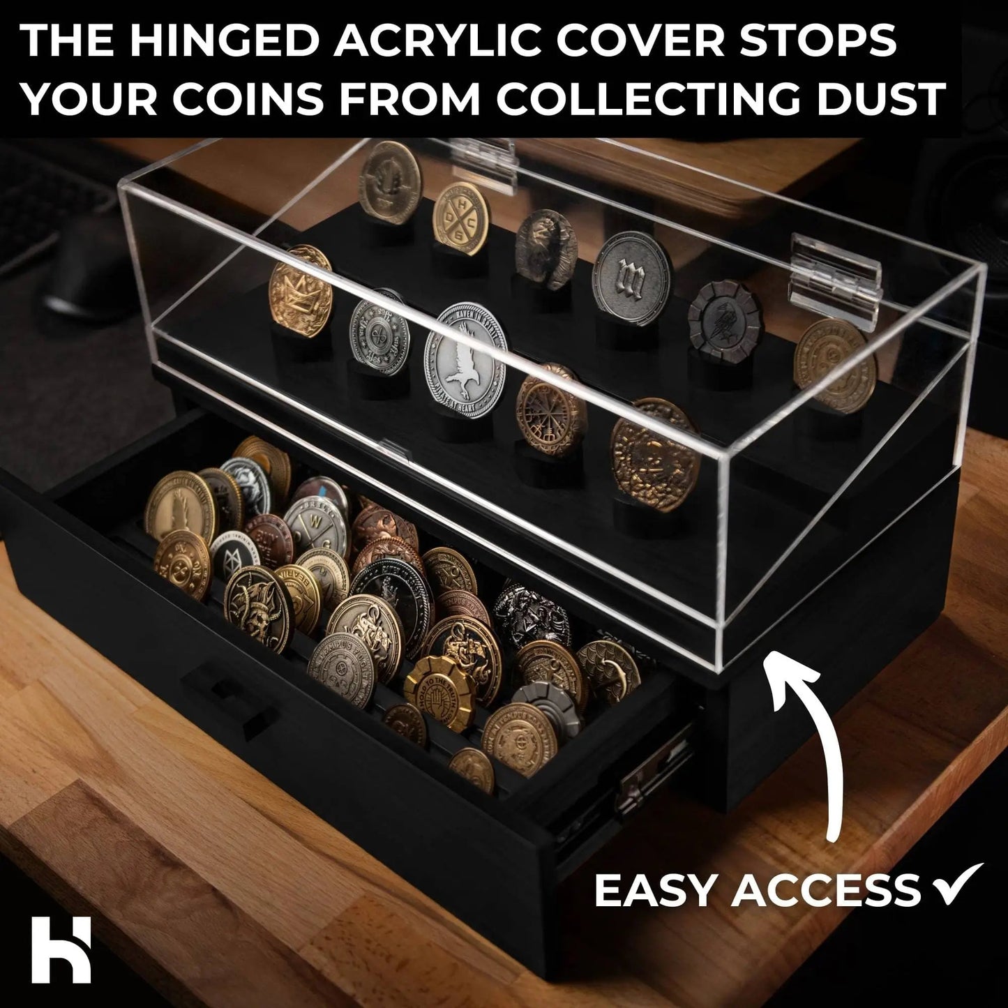 - FITS VARIOUS COIN SIZES — Your feedback matters to us. That's why we've increased the height of the acrylic cover and the drawer, ensuring compatibility with larger coins. Whether you collect standard-size challenge coins or larger commemorative pieces, The Chest provides ample space to store and showcase your entire collection. Plus, the drawer is now equipped with smooth-running metal rails for easy operation.