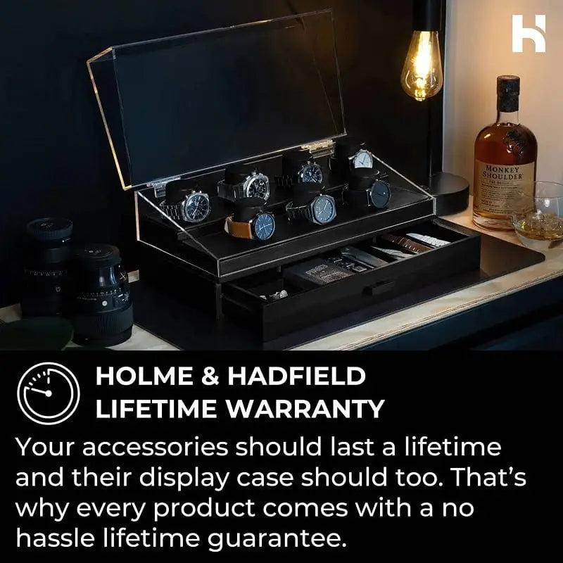 Why collect nice watches without a proper watches box to display them? The hinged acrylic cover on this collectors watch box keeps the dust off your watches while providing a fantastic 360-degree view of 7 of your best timepieces. The large wooden drawer beneath provides storage for your everyday accessories