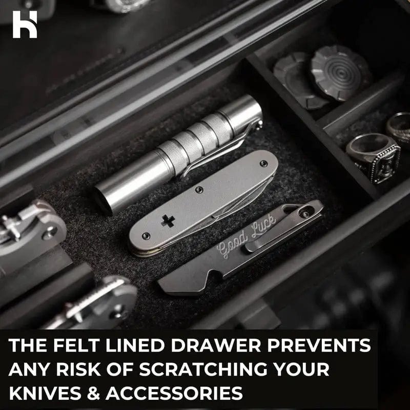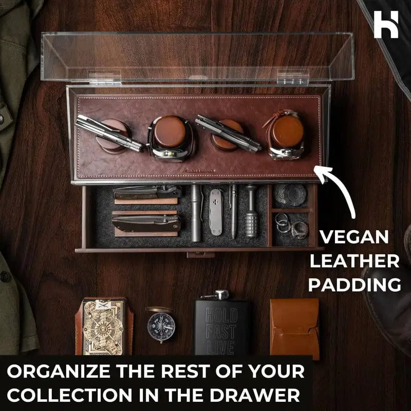 The innovative interchangeable posts set this knife and watch box organizer for men apart from the competition.