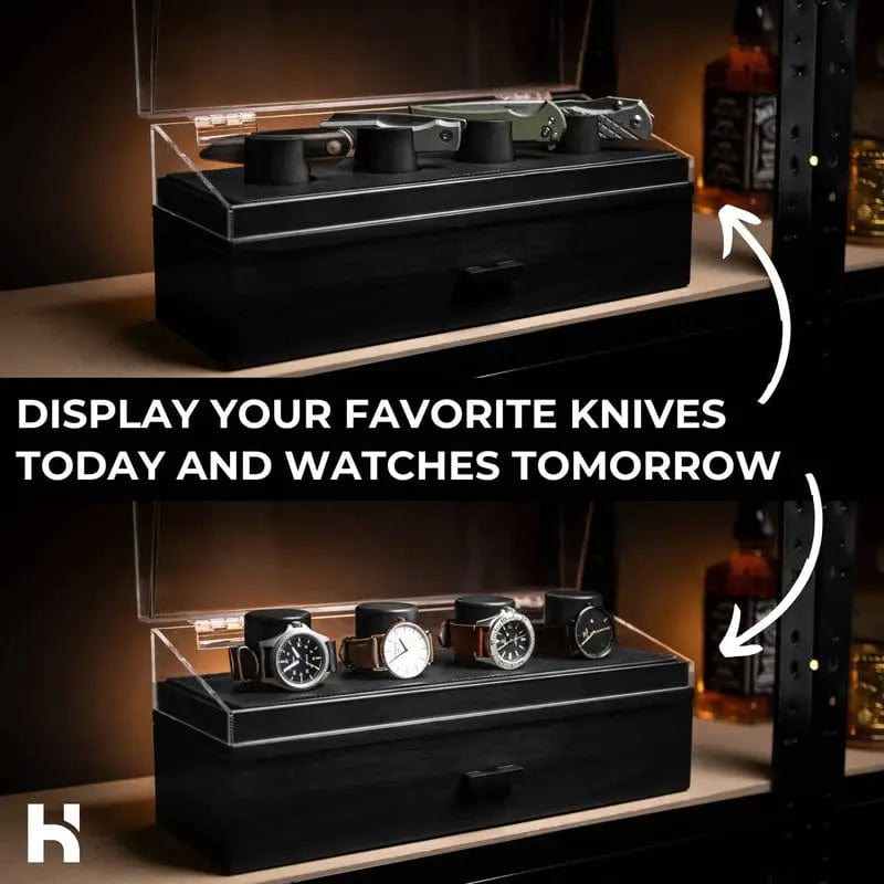 The transparent acrylic cover stands at a 90-degree angle, so you can easily select your timepiece or knife from your watch boxes.