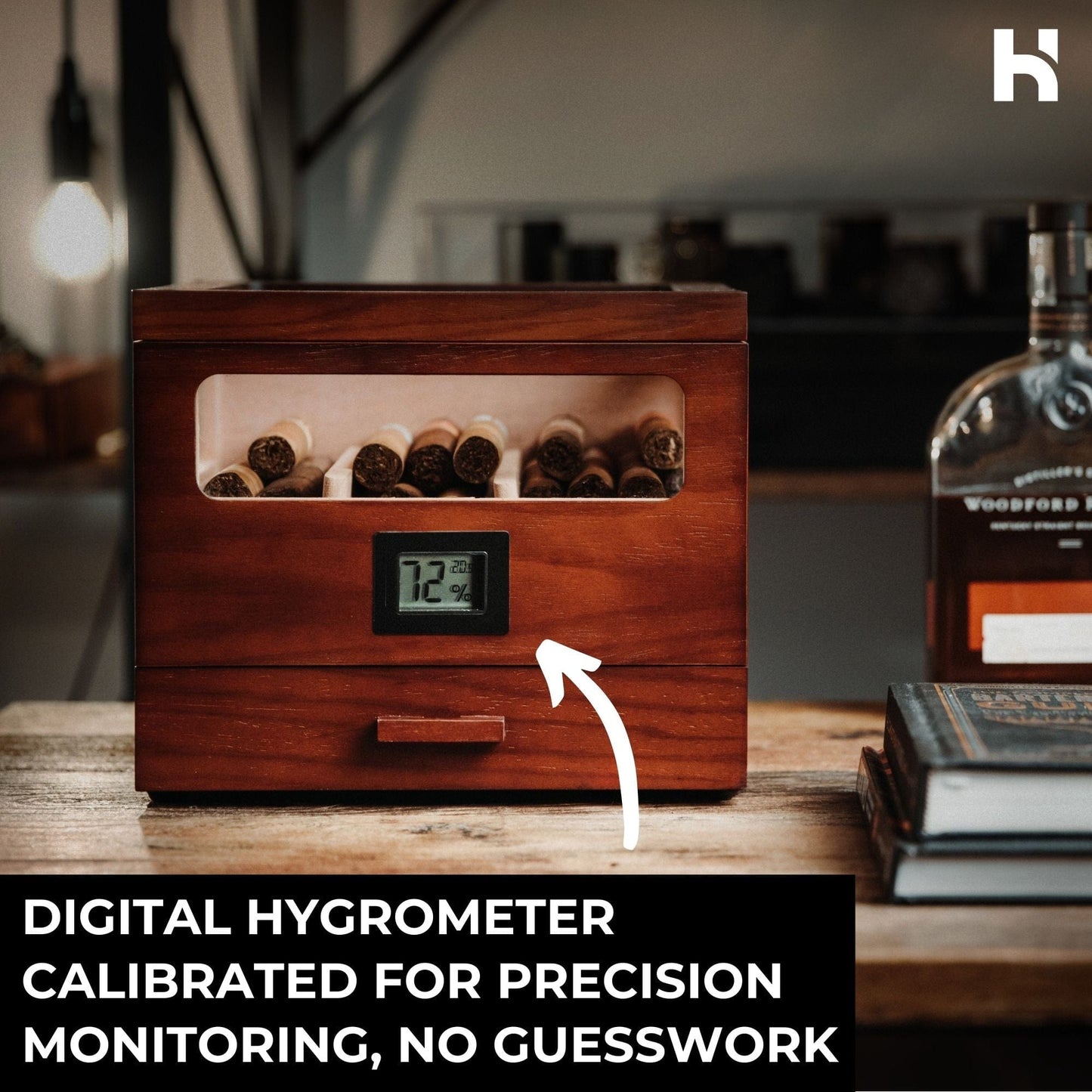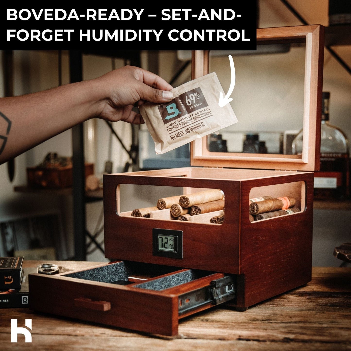 Premium cigar humidor with 360° views, airtight seal, Spanish cedar lining, precision hygrometer, smooth drawer design, and Boveda-ready storage. Crafted for true aficionados.