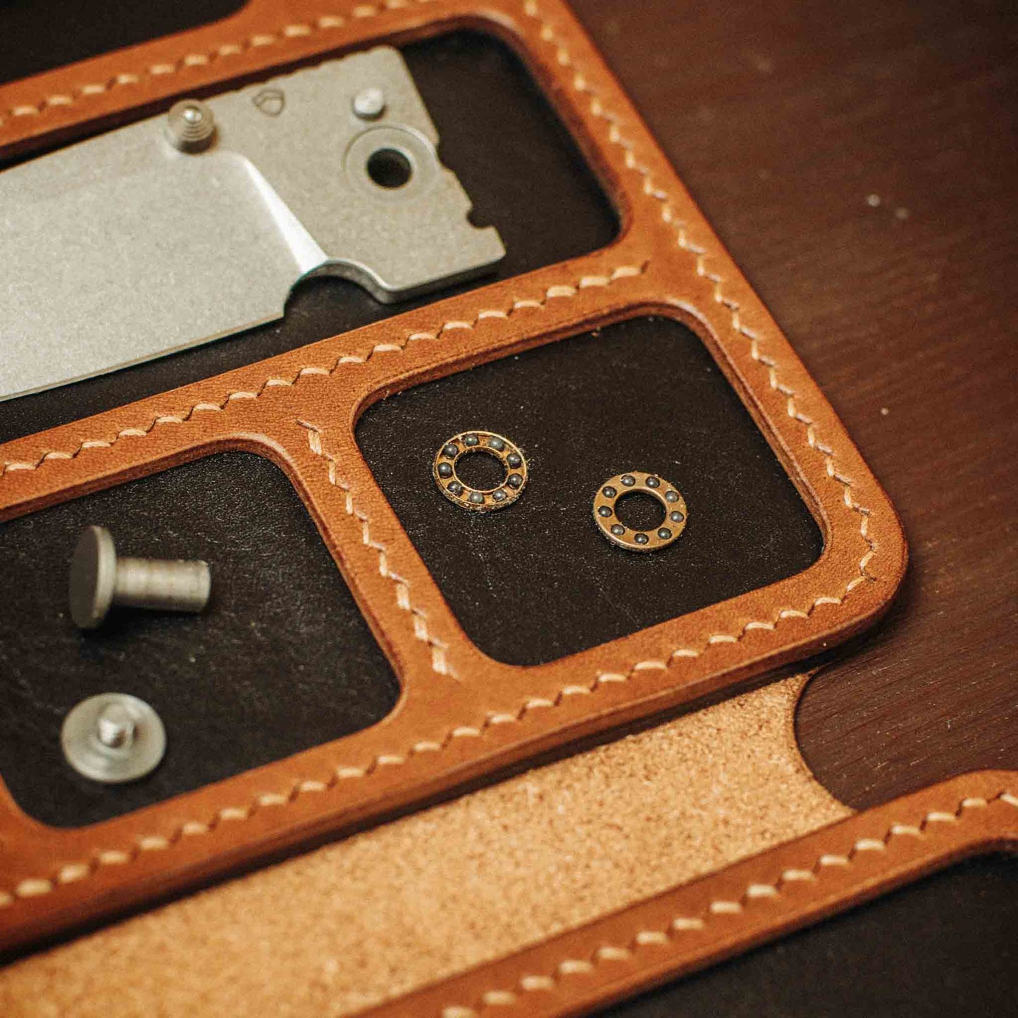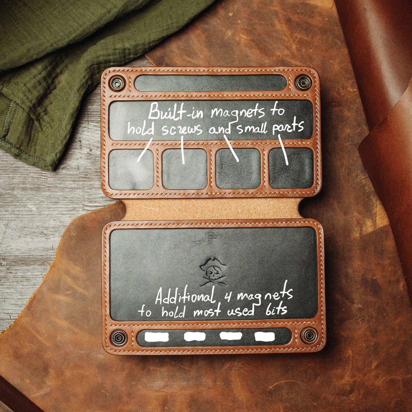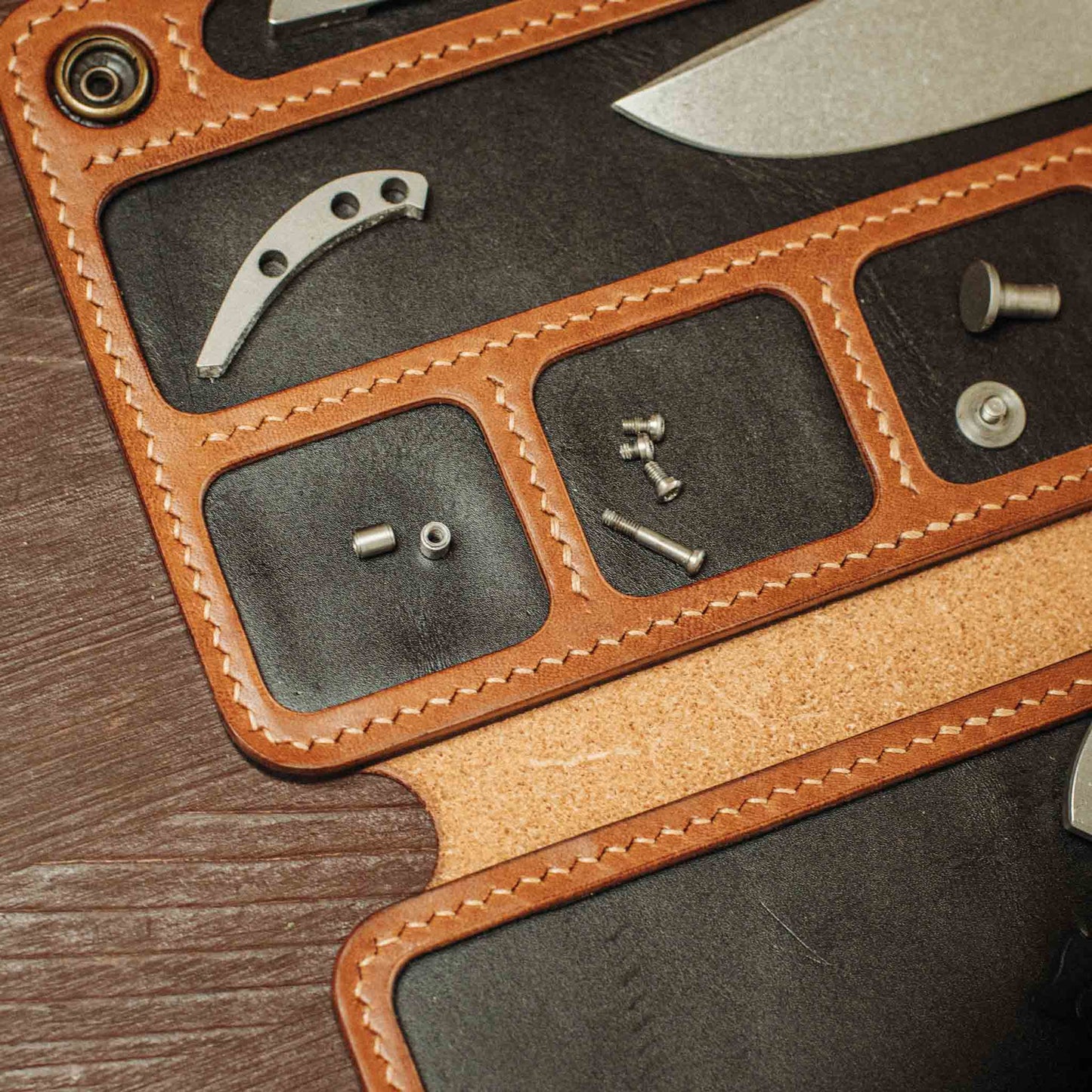 Meet the Shipyard! This handmade leather knife mat serves as a comprehensive solution and repair surface for your workshop, featuring magnetic compartments that keep your tool organization perfect for knife maintenance. This portable tool pad is crafted from durable 1.2 mm full grain leather, making it an ideal addition to any serious knife collector's workspace.