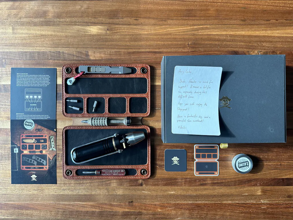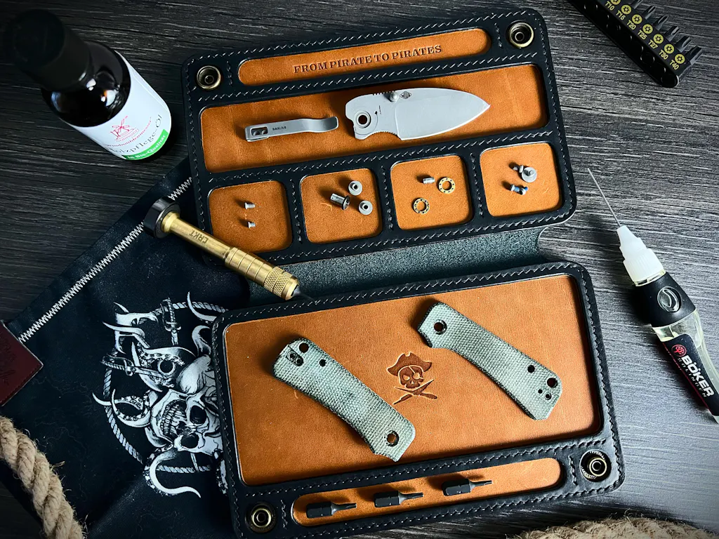 Meet the Shipyard! This handmade leather knife mat serves as a comprehensive solution and repair surface for your workshop, featuring magnetic compartments that keep your tool organization perfect for knife maintenance. This portable tool pad is crafted from durable 1.2 mm full grain leather, making it an ideal addition to any serious knife collector's workspace.
